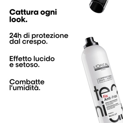 TecniART Fix Anti-Frizz è uno spray anti crespo e anti umidità con tenuta fino a 24 ore. Permette di tenere sotto controllo il tuo look: un must-have per domare i tuoi capelli e il crespo indesiderato. Dona capelli brillanti a lunga durata, look con tenuta forte e un controllo del crespo garantito.