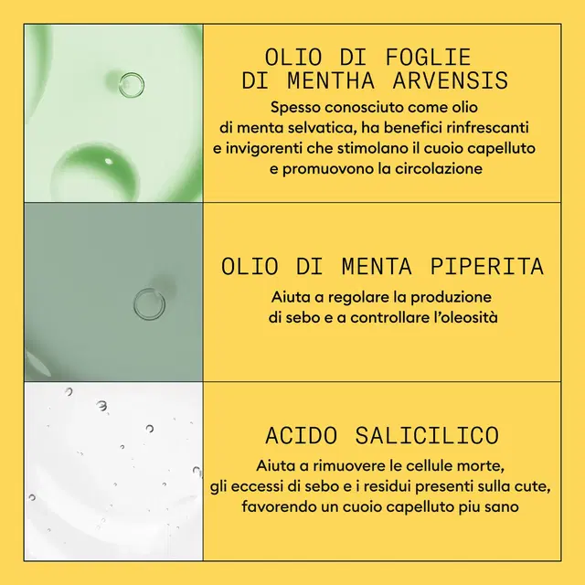 ACIDO SALICILICO: Aiuta a rimuovere le cellule morte, gli eccessi di sebo e i residui presenti sulla cute, favorendo un cuoio capelluto dall'aspetto più sano