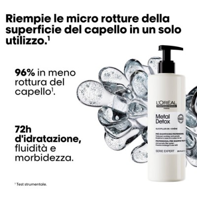 Trattamento Pre-Shampoo Metal Detox: il trattamento professionale che riempie le micro rotture e rinforza il capello prevendo l'eccessivo assorbimento di acqua. Tecnologia brevettata con Glicofiller che agisce su due livelli: sulla superficie avvolge il capello e riempie le micro rotture, nella fibra penetra il capello e riempie la parte corticale. Il risultato? -96% in meno di rottura del capello, 25x capello più forte. Districa istantaneamente tutti i tipi di capelli. 72h d'idratazione, fluidità, e morbidezza. Capelli protetti dalla rottura ed un colore brillante & duraturo.