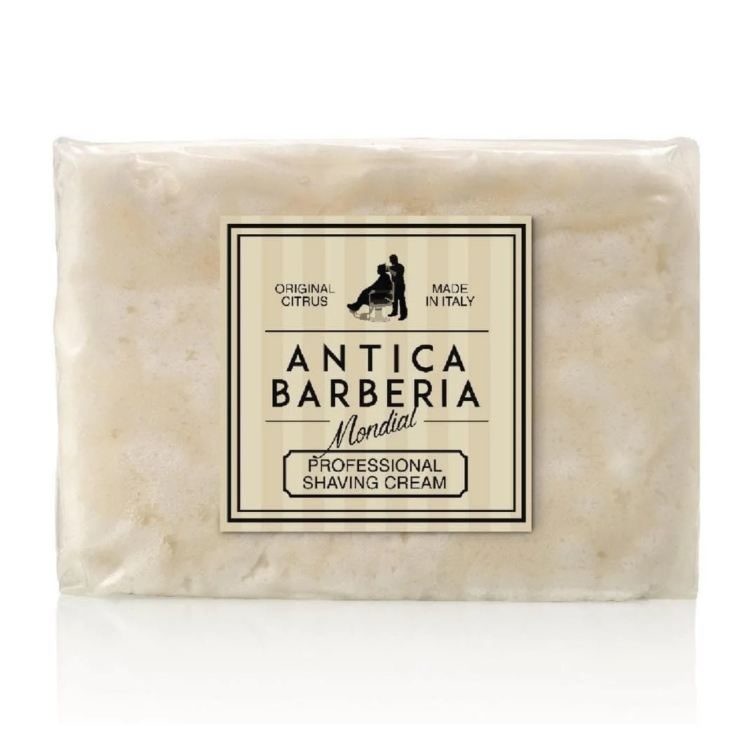 Un solido tradizionale crema da barba nella fresca e vivace fragranza Original Citrus presentata in una confezione da 1000 ml adatta all'uso professionale presso un barbiere per produrre una schiuma ricca e cremosa utilizzando un pennello e una ciotola.