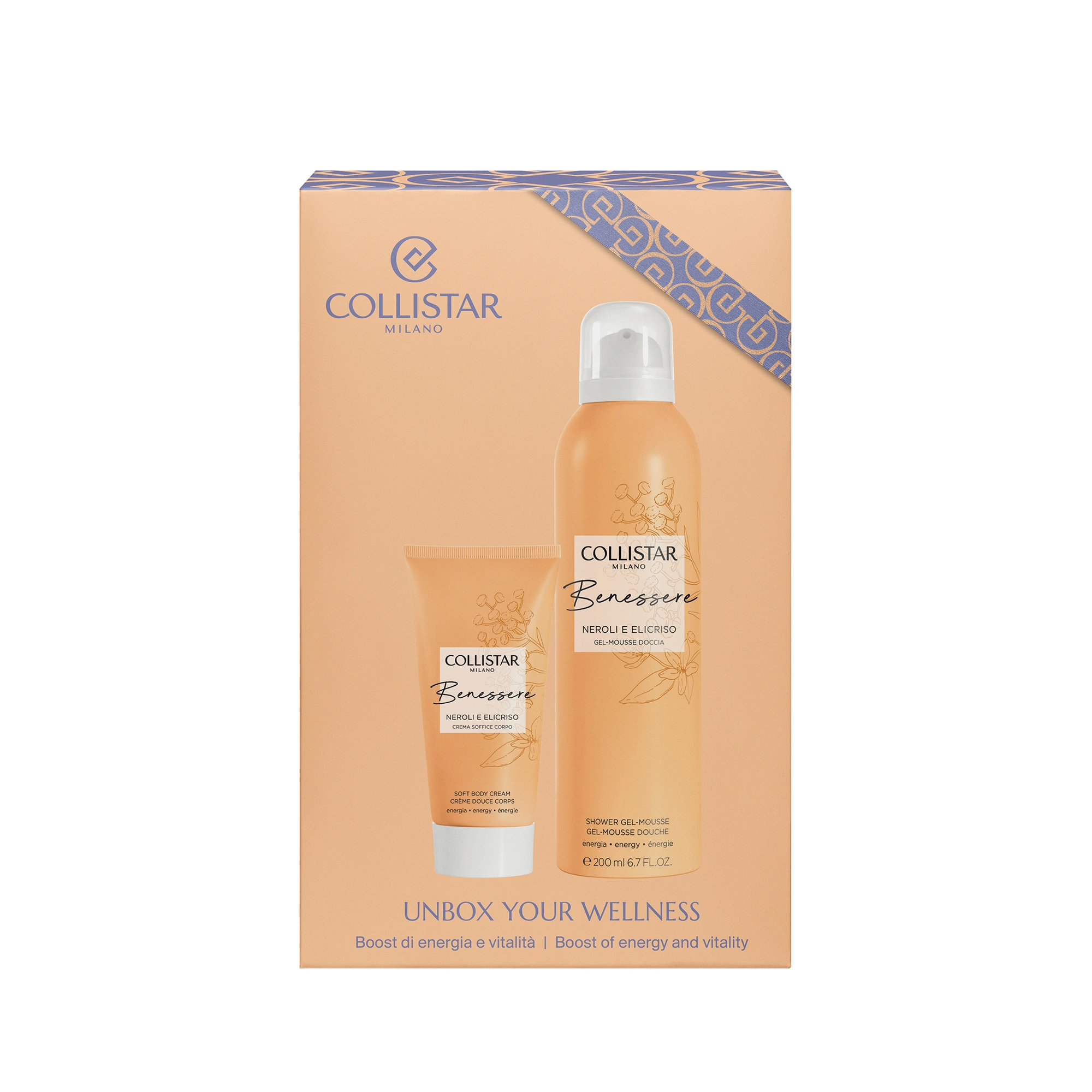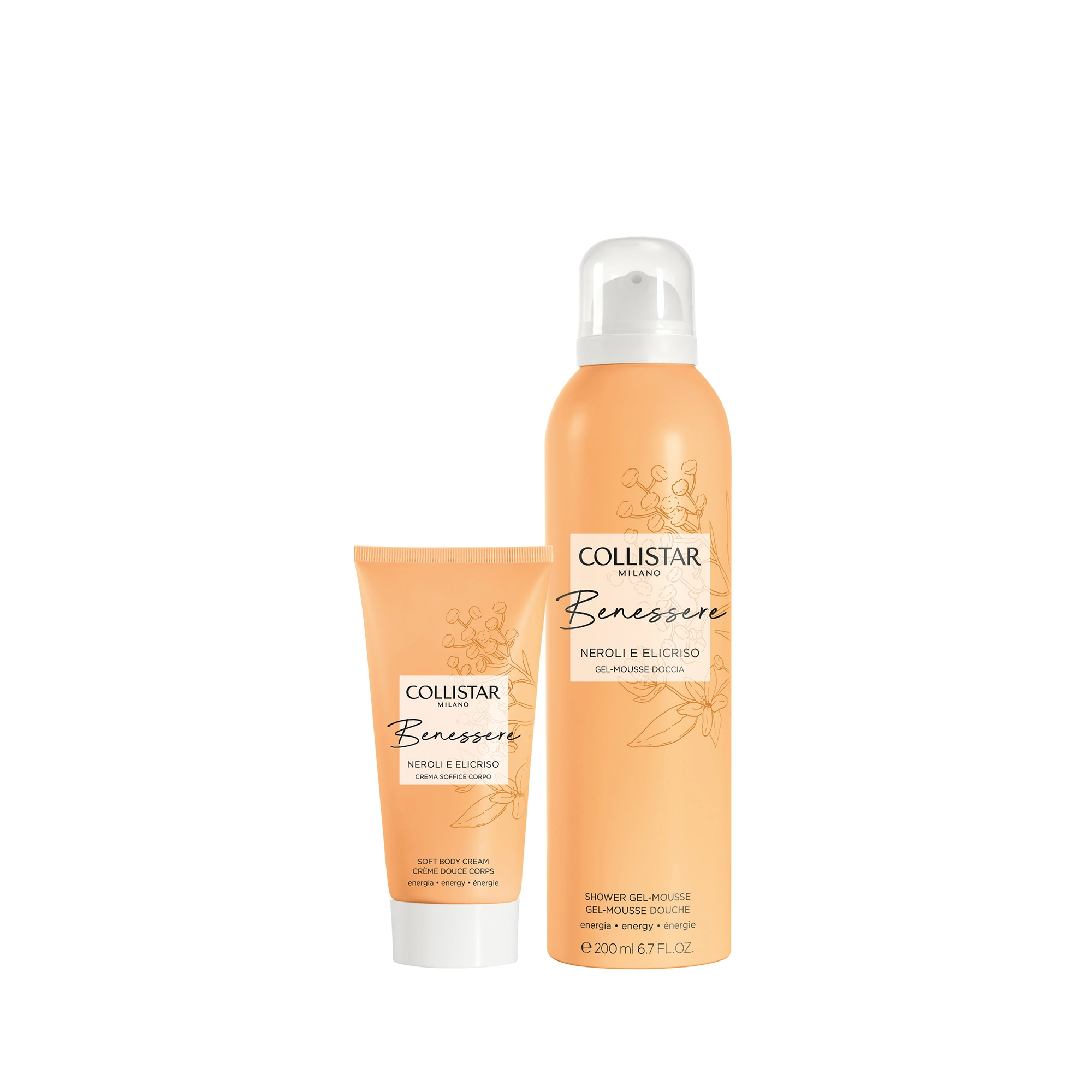 GEL-MOUSSE DOCCIA: Un soffice gel che, trasformandosi in una cremosa mousse, avvolge voluttuosamente il corpo detergendolo delicatamente. Gli estratti di Fiori d’Arancio ed Elicriso italiani rendono la pelle subito più morbida e idratata. Il plus della formula? Al suo interno uno speciale attivo di neurocosmesi, l’estratto di Pepe di Timut, che stimola una sensazione di energia e positività . La sua fragranza, dalle briose note agrumate, esaltate da un bouquet soave di neroli, che si fondono a tocchi aromatici e profondi di elicriso, avvolge il corpo e la mente lasciando sulla pelle un leggero profumo e rendendo la doccia un’esperienza di benessere totale.